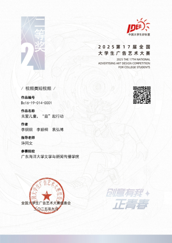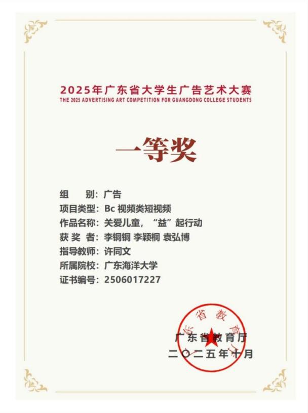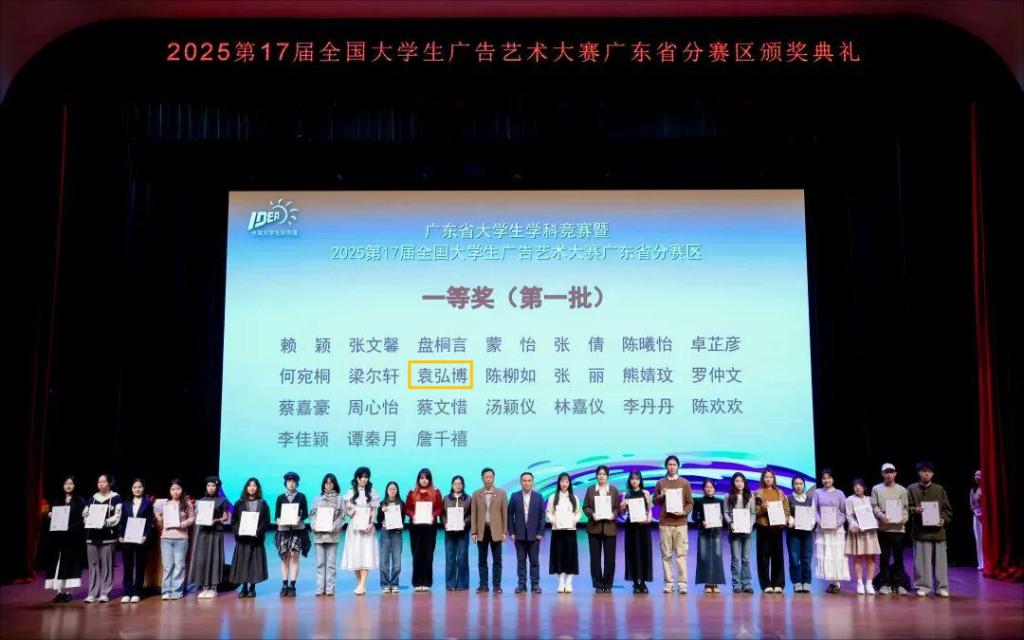 11月22日,第17届全国老员工广告艺术大赛(以下简称大广赛)广东赛区颁奖总结交流活动在广州商公司举行。球盟会共获一等奖1项、二等奖1项、三等奖2项。其中,李铜铜、李颖桐、袁弘博的作品《关爱儿童,“益”起行动》荣获省级一等奖、国家级二等奖。许同文老师被广东省教育厅评为“优秀指导教师”。
