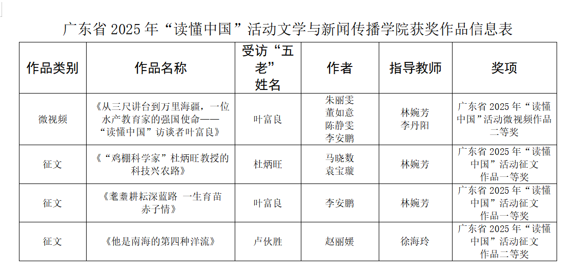 本次“读懂中国”活动以挖掘“五老”(老干部、老战士、老专家、老教师、老模范)典型事迹、传承榜样精神为核心主旨。公司获奖作品紧扣这一主题,采用征文、微视频等多元体裁,生动还原了“五老”群体的初心使命与奋斗历程。其中,征文类作品《“鸡棚科学家”杜炳旺教授的科技兴农路》《耄耋耕耘深蓝路 一生育苗赤子情》凭借细腻的笔触、详实的调研,荣获征文类一等奖;《他是南海的第四种洋流》以独特的叙事视角获征文类二等奖;微视频作品《从三尺讲台到万里海疆,一位水产教育家的强国使命——“读懂中国”访谈者叶富良》则通过丰富的视听语言,立体呈现了教育工作者的强国担当,斩获微视频类二等奖。